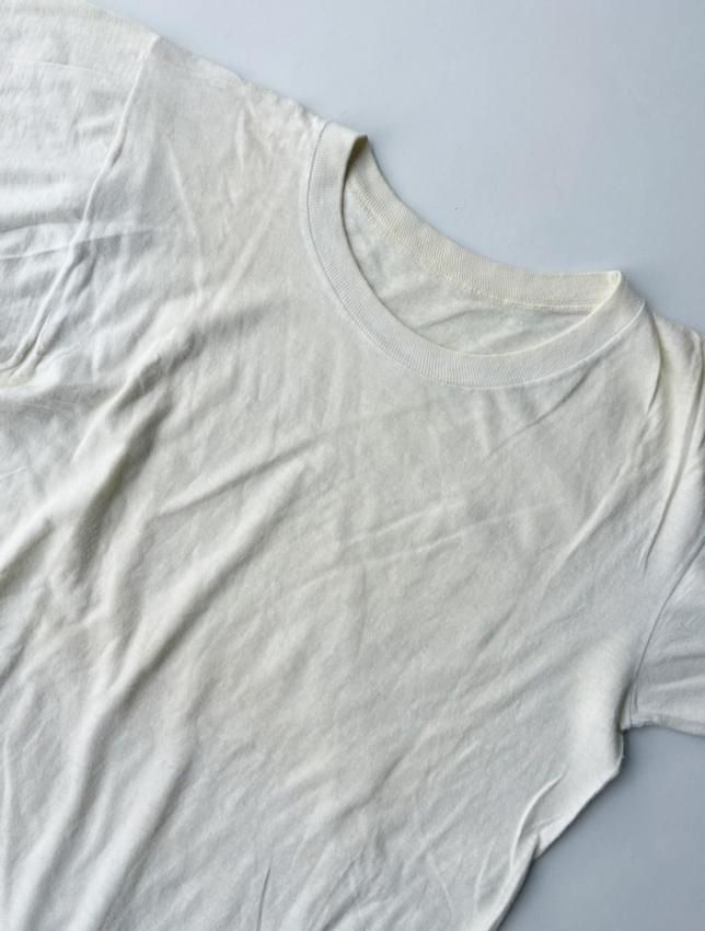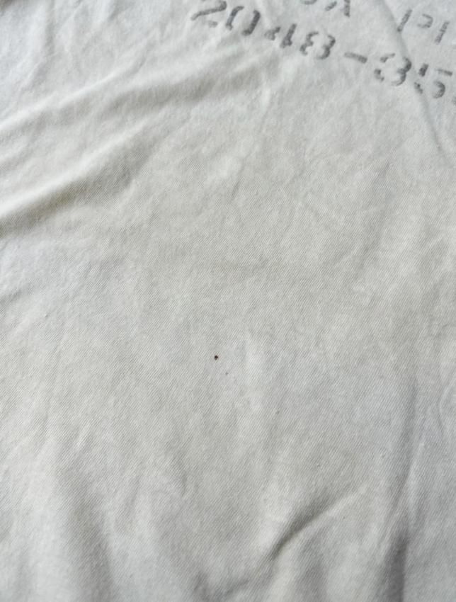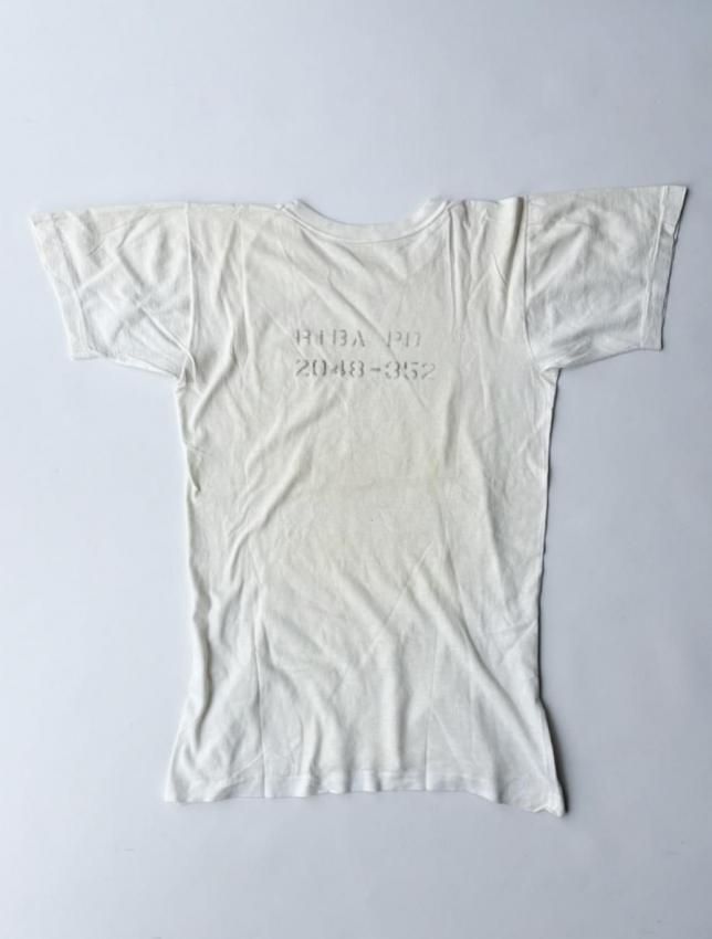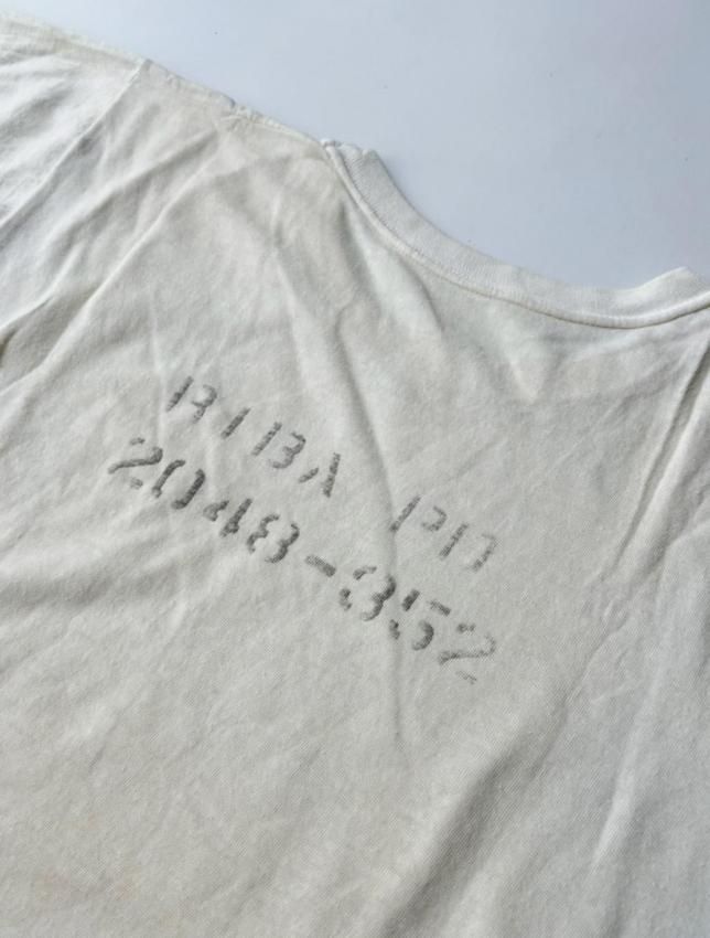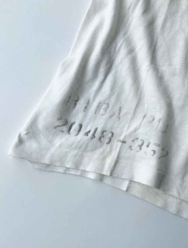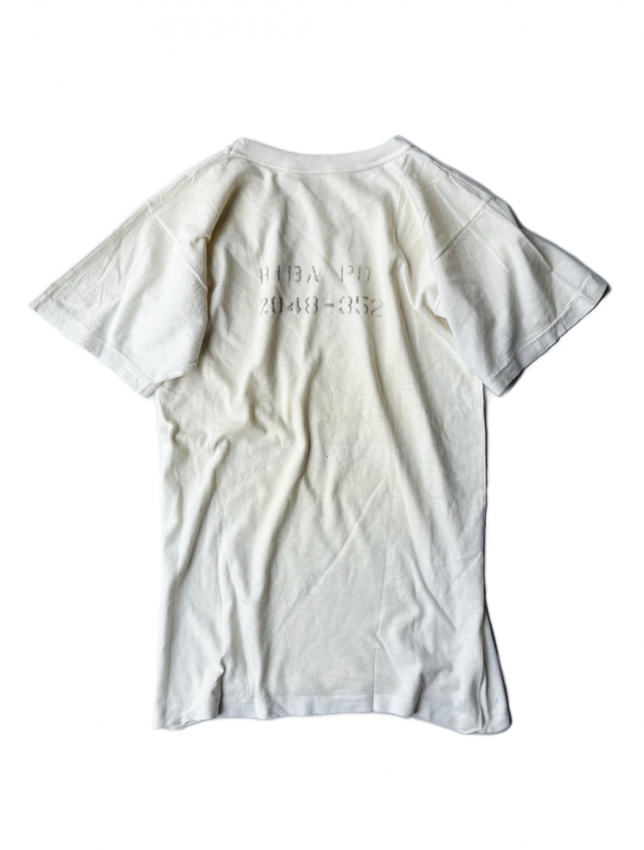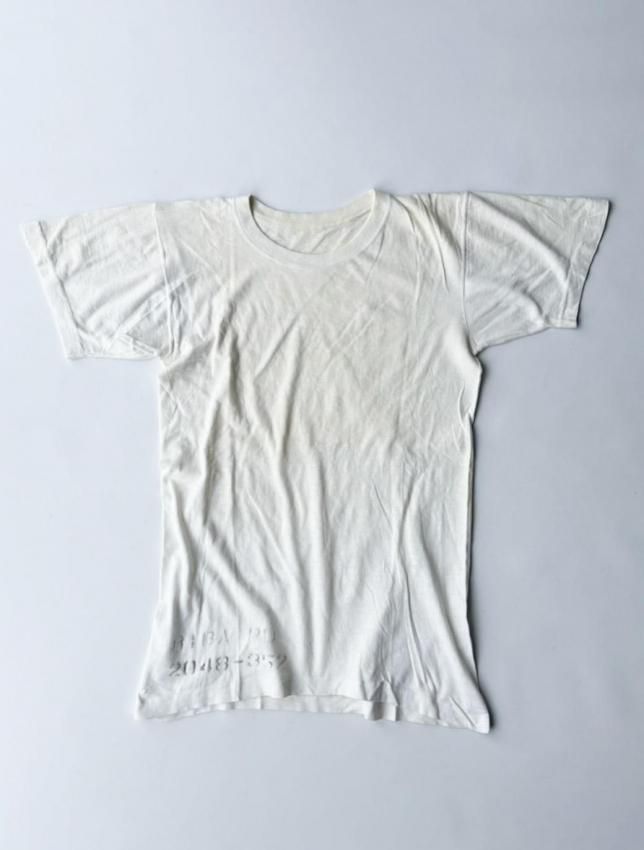 50年代から60年代頃のものと思われるミリタリーTシャツのご紹介です。 フロント・バックともに同じステンシルが入った一枚になります。 クルーネックタイプで、ボディはおそらく綿100%かと思われます。 フロントはサイド下部、バックは背中上部にステンシルが入り、計算されていないようでいてバランスの取れた配置が秀逸です。 コンディションは経年変化による変色が見られますが、いずれも年代物ならではのものとしてご理解いただける範囲で、着用には支障のない程度です。使用感は少なく、大変良好な状態です。 これだけステンシルの存在感があるものはなかなか出てきませんので、サイズの合う方はぜひご検討ください。 |