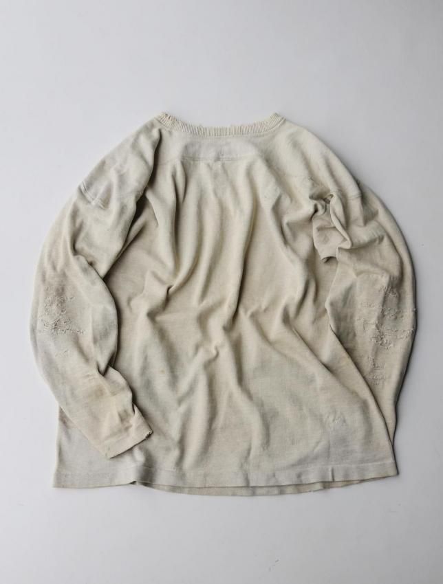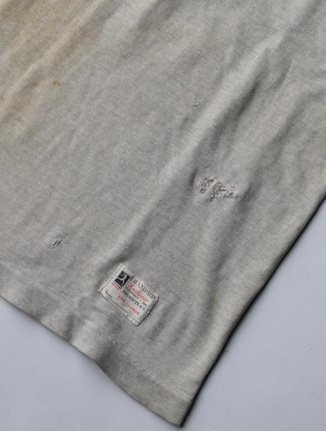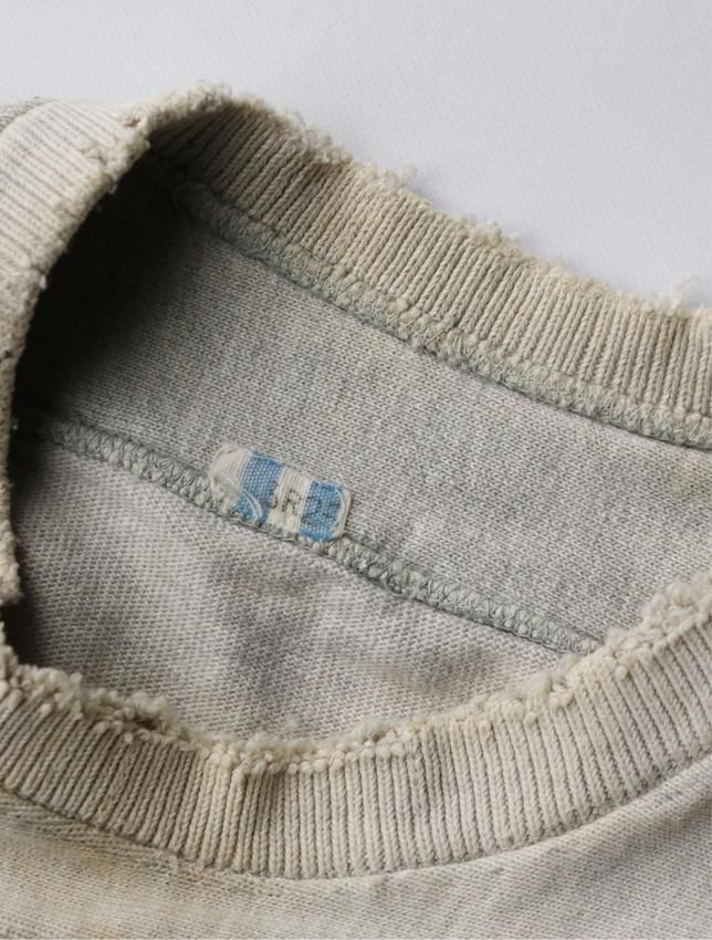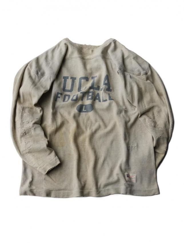 40年代のデカランタグが付く Champion フットボールTシャツのご紹介です。 厚手のコットンボディーで、この年代特有の質感が魅力です。プリントはブルーの UCLA カラーによる染み込みプリントで、カプセルを含めた三段構成になっています。 コンディションは、袖に大きなダメージがあったため日本国内でリペアを施しています。 当店でも数年ぶりの入荷となる、極めて希少な一枚です。 お盆にご紹介するにふさわしいスペシャルピースですので、この機会にぜひご検討ください。 |