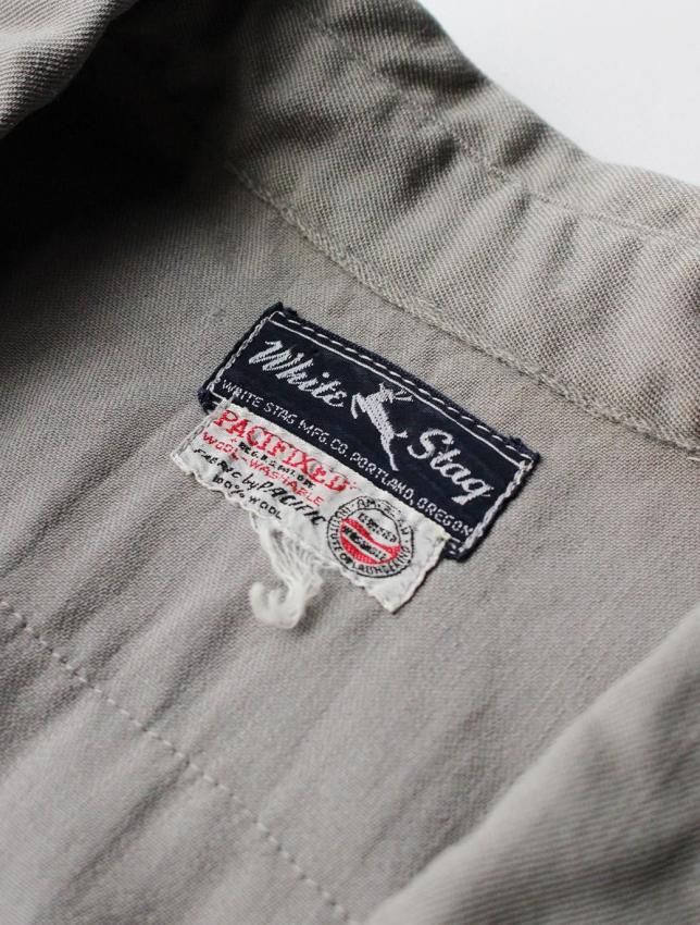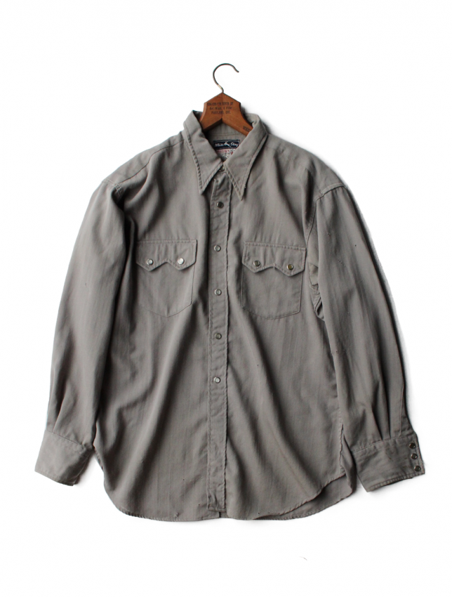1940〜50年代頃の White Stag ウエスタンシャツのご紹介です。 落ち着いたグレー単色の上品な一枚で、タグには「Pacifixd Wool」と記載があり、当時としては画期的な“洗えるウール素材”が使用されています。 スタイルは当時のウエスタンシャツらしいディテールを踏襲しており、襟はロングポイント仕様。胸ポケットのフラップは人気の高いソートゥース型となっています。 コンディションについては、胸ポケットフラップのスナップ土台、カフスのスナップが欠損、全体的に小穴の点在がありますが、着用には問題ございません。その他には多少の使用感は見られるものの、特筆すべき大きなダメージはなく、全体的に良好です。 古いウエスタンシャツの中でも落ち着いた色味と使いやすいディテールが魅力の一枚。しっかりと洗えて日常使いしやすいため、メンテナンス面でも安心いただける個体です。サイズ感も良好ですので、ぜひこの機会にご検討ください。 |