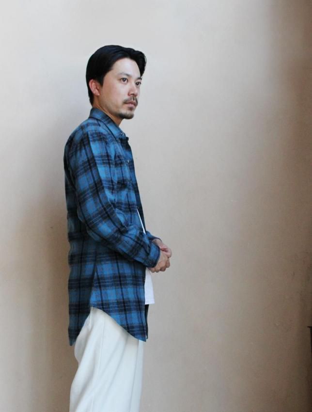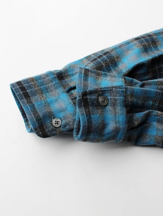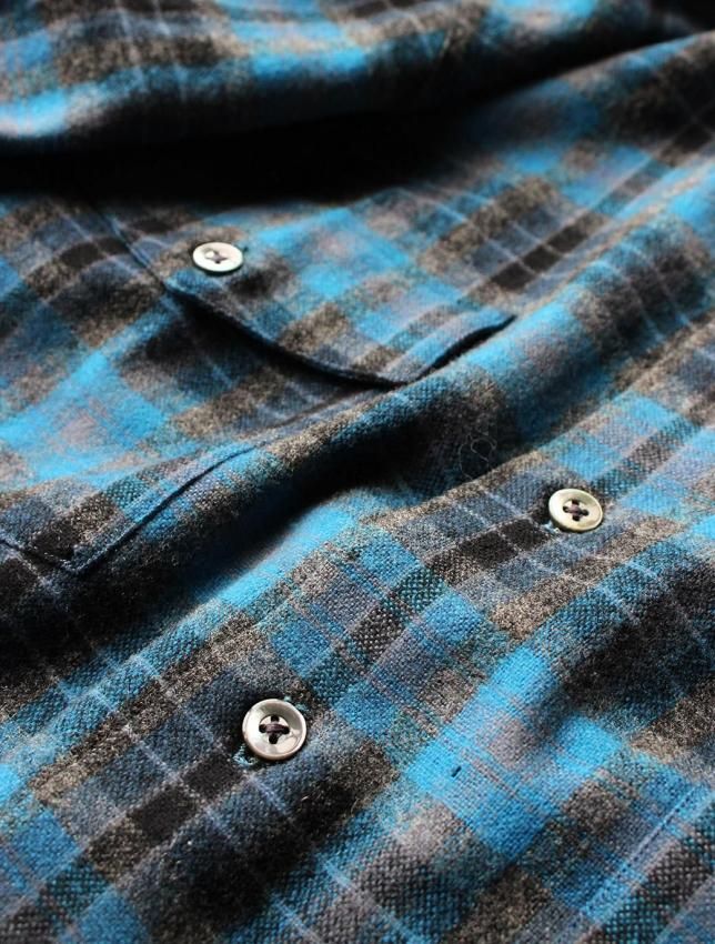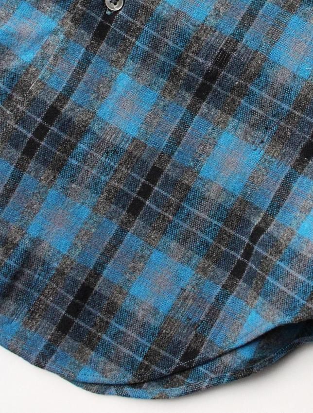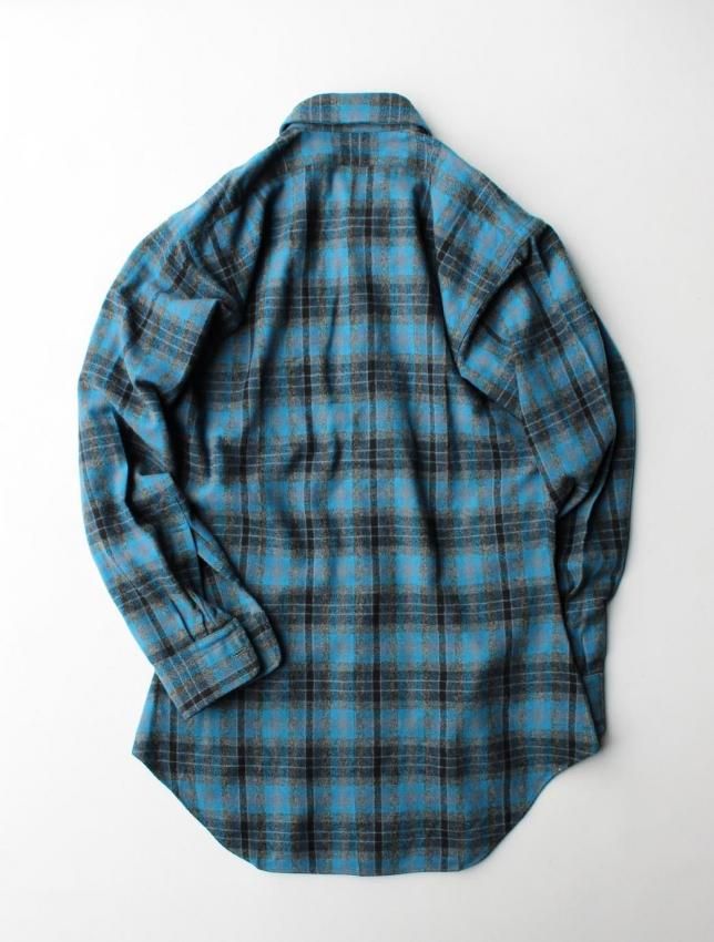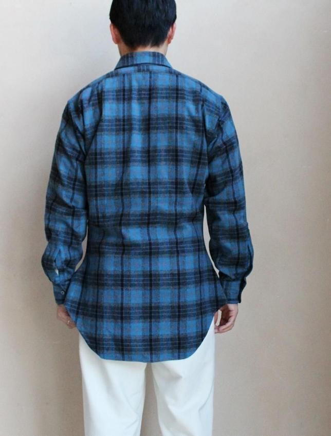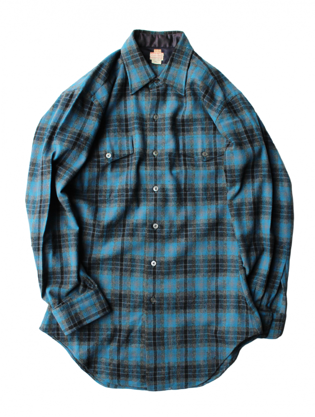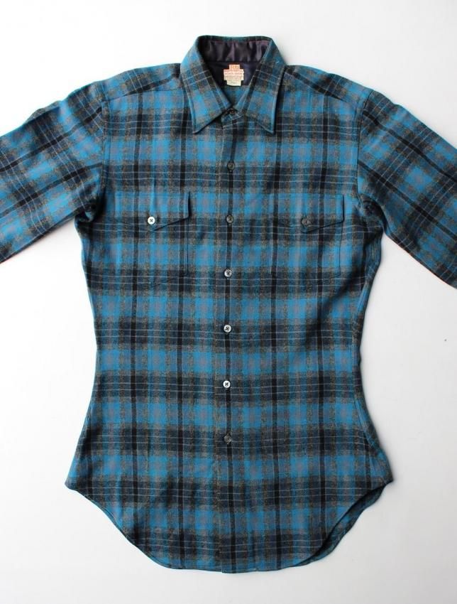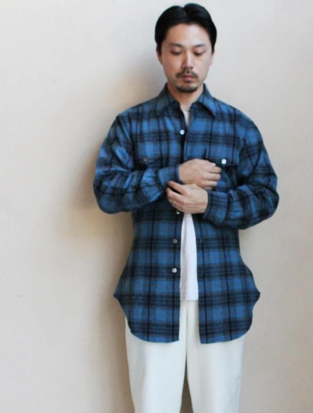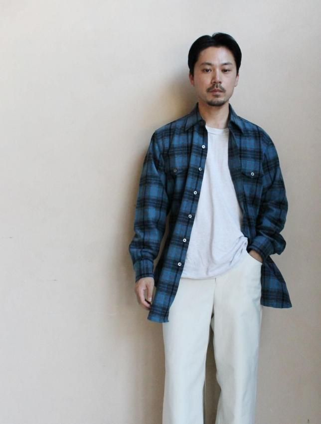 1950〜60年代頃にアメリカ・カンザス州の中西部で活動していたシャツメーカー、Wichita Shirts Co. のウールシャツのご紹介です。 カラーはブルー、グレー、ブラックを基調とした落ち着いたダークトーン。 スタイルは台襟付きの襟にフラップ付き胸ポケット、裾はラウンドカット仕様で、ウエスタンシャツを思わせるシルエットが特徴です。 メーカーの詳細は不明ですが、当時オーダーメイドで製作された可能性もあります。 コンディションは裾付近に虫食いのダメージ補修はありますが、非常に良好で、ウールの状態も良好です。 着丈はやや長めの設計で、タックインでの着用もおすすめです。 中西部の希少なメーカーによるウールシャツで、その風合いと質感はペンドルトンにも劣らない高いクオリティを誇ります。 お求めやすい価格設定となっておりますので、この機会にぜひご検討ください。 |