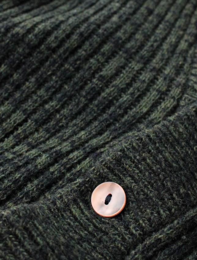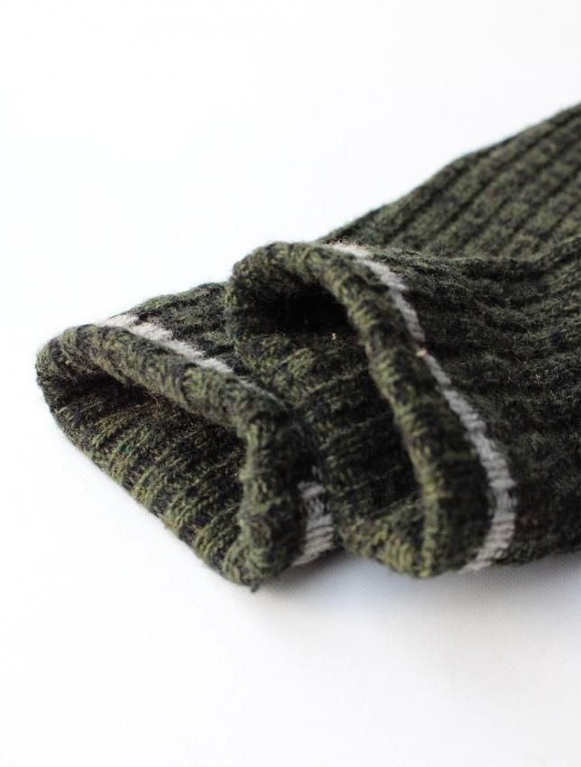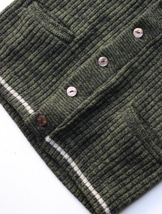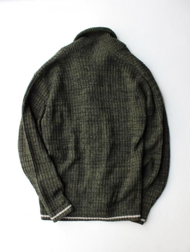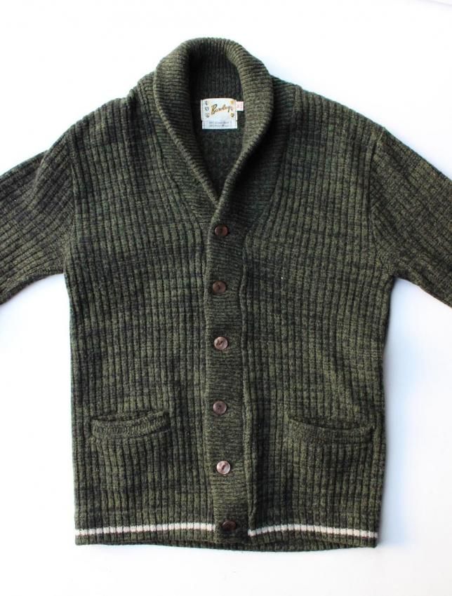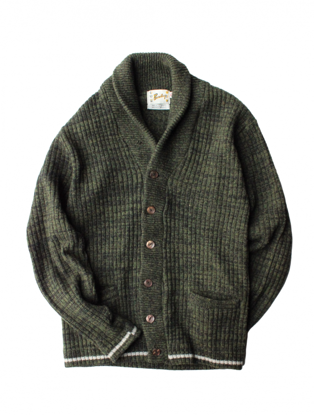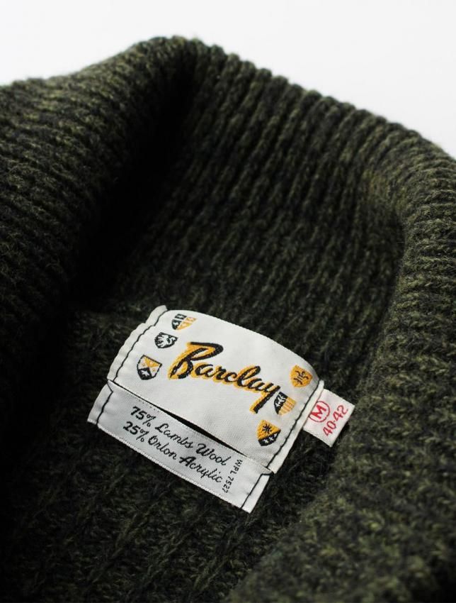 50年代頃の Barclay ブランドのウールカーディガンのご紹介です。 名前からカリフォルニアのメーカーを連想しますが、実はニューヨークの老舗ブランドになります。 50年代頃の物に名品が多く、50s ラバーにはご存知の方も多いと思います。 今回ご紹介のカーディガンは ショールタイプ の一枚になります。 ローゲージのセーターとは違い、柔らかな質感の個体です。 ボディはモスグリーンと黒が混ざった糸で織られ、同年代らしい落ち着いた色目。 腰と袖にはラインが入り、これも 50s を連想させる好ディテールです。 ボタンは大きめで光沢のある雰囲気の良いものが使用されており、こちらも好印象です。 コンディションは、恐らく未使用と思われるほど素晴らしい状態で、ウールの質感も申し分ない ミントコンディション の一枚になります。 サイズは M 表記ですが、横記載の通り 40〜42 の大きめサイズですので、ゆったり着用していただけます。 この年代のセーターは上質で品が良く、ブランドを考察しても当時の高級セーターと言えます。 落ち着いたカラーリングですので、どの様なパンツにも合わせやすく、大人のカーディガンとして着用していただきたい一枚です。 |